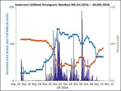 Fig. 3. Histogram of hourly WWLLN lightning, along with wind (blue) and pressure (orange) data, for Hurricane Matthew in 2016. A peak in lightning rate on 6 October precedes rapid weakening of the storm. Credit: WWLLN-TC