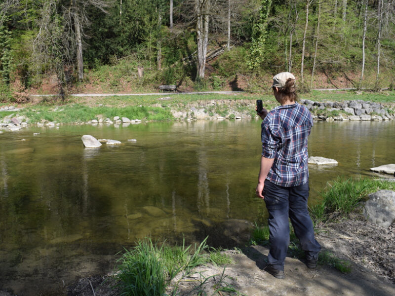 A CrowdWater user takes a photo of a stream. Adding a virtual staff gauge to the photo using the app enables users to compare stream levels among several photos without the need for physical installations or sensors. Credit: Rolf Klossner